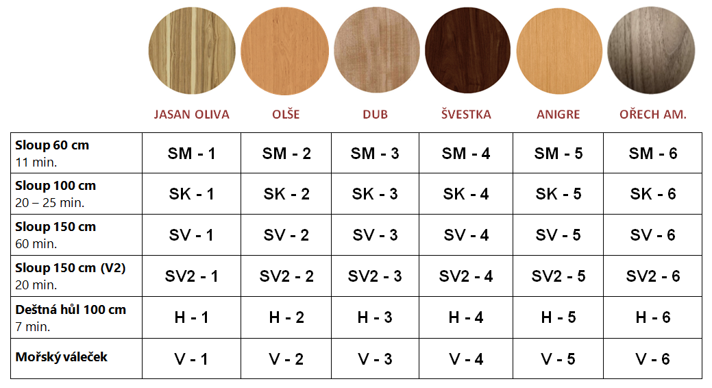 Vzorník používaných materiálů s kódy výrobků pro objednání